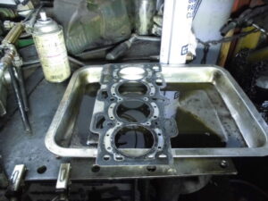 サンバーワゴン 室内のヒーターが弱い、ブレーキオイルが漏れて効きが悪いなど複数の案件が発生している様で当社に入庫、ヒーターが弱いのでサーモスタットでしょ?ところがリフトに上げエンジン付近を見ると、ヘッドガスケットよりオイル漏れ、それにタイミングベルトにオイルが付着している為、タイミングベルト交換など修理ヶ所がどんどん増えてます。 車検整備が入庫したり、日々フル回転のサービス工場でした